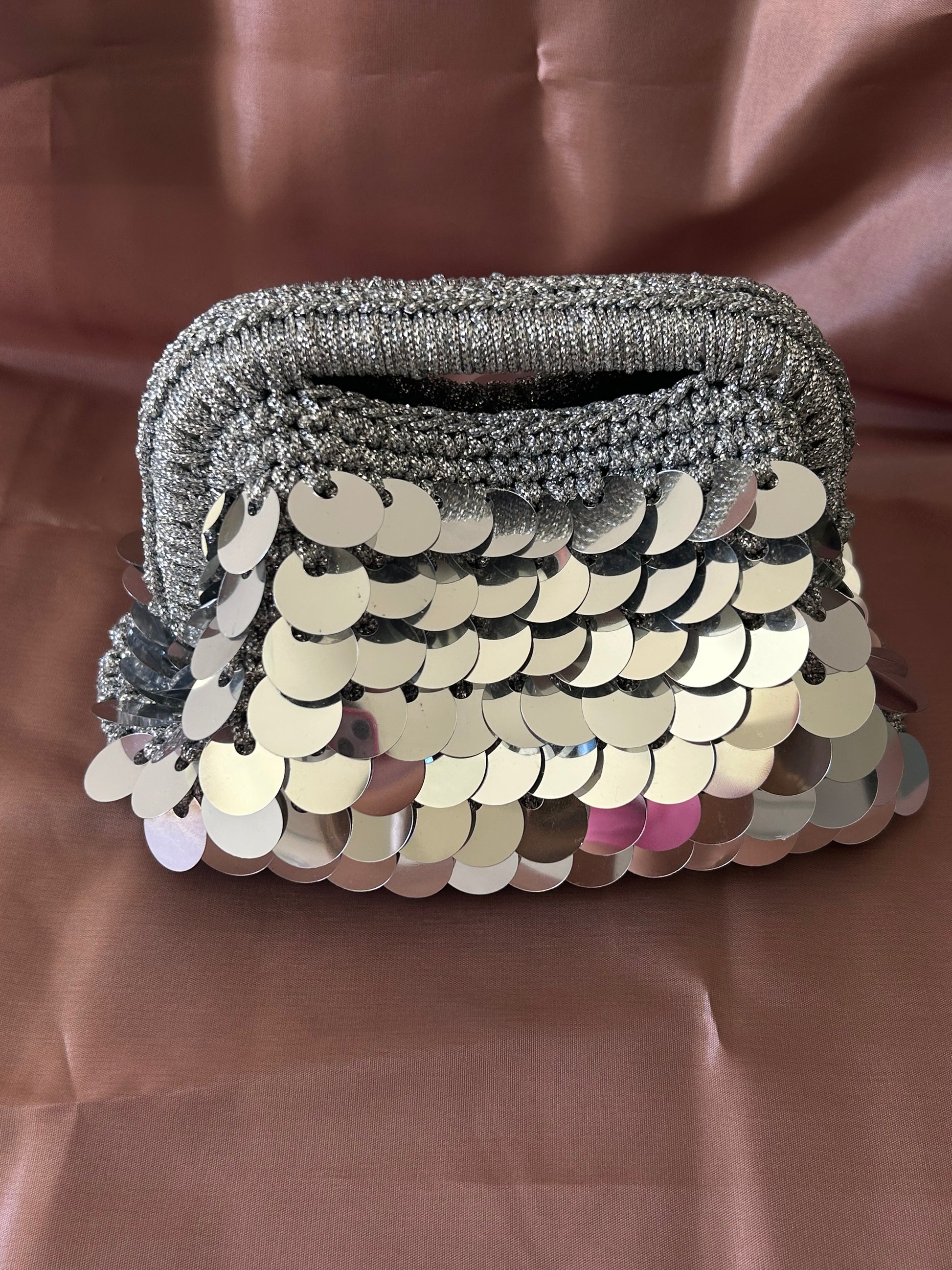 Borsa con chiusura a molla in cordino lurex e paillettes abbinate.